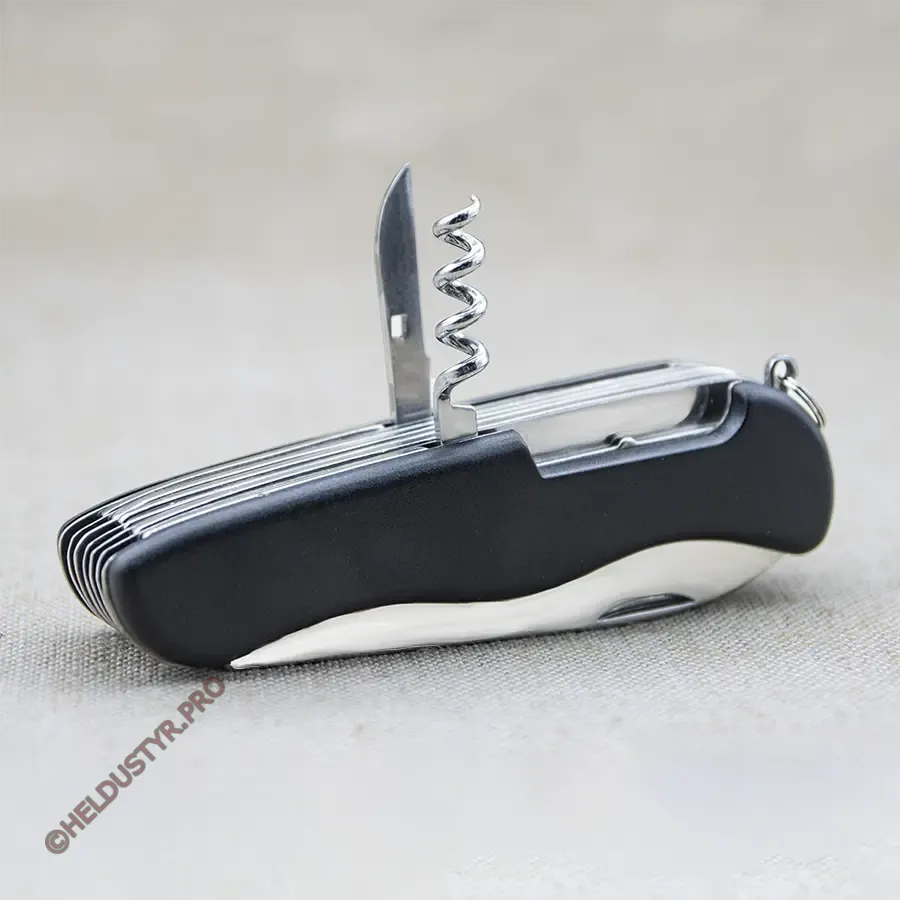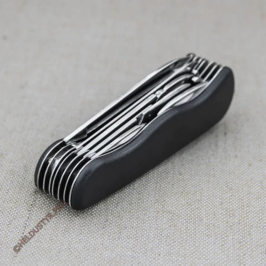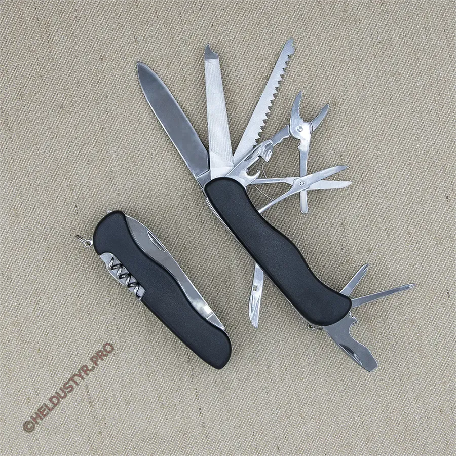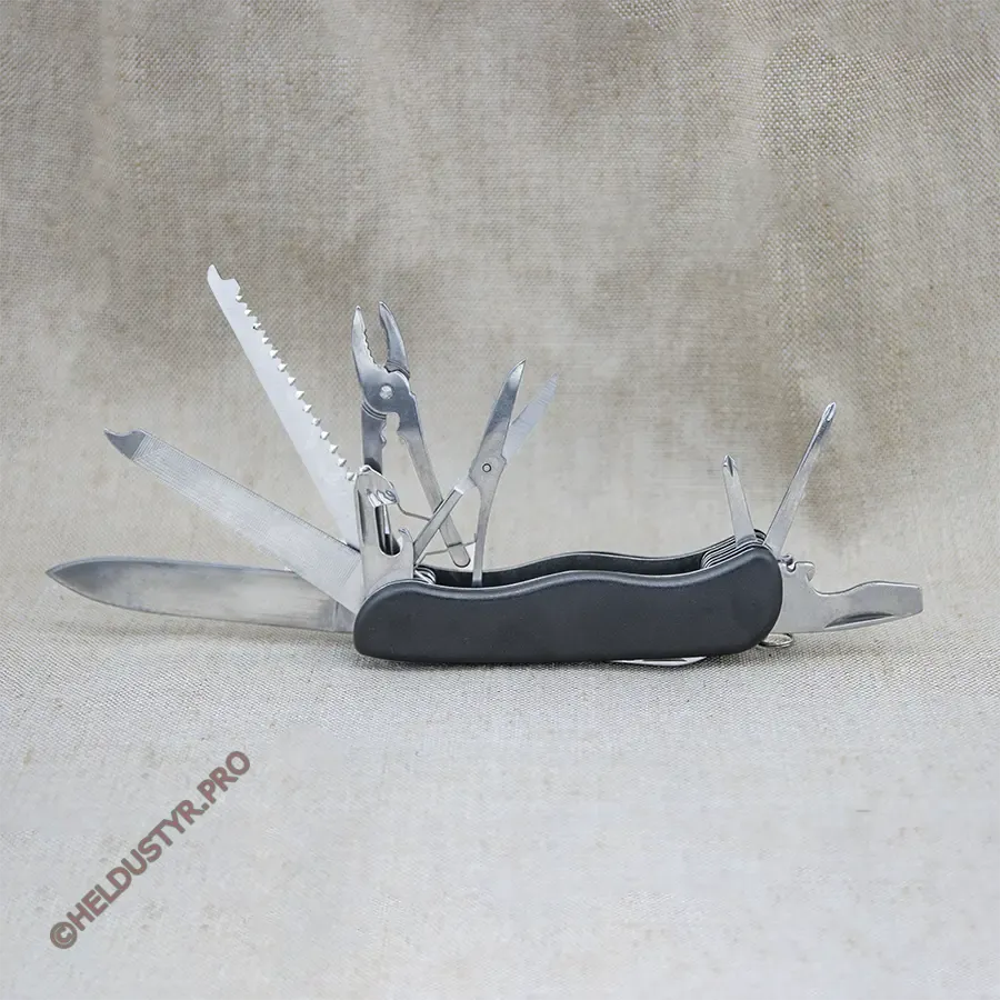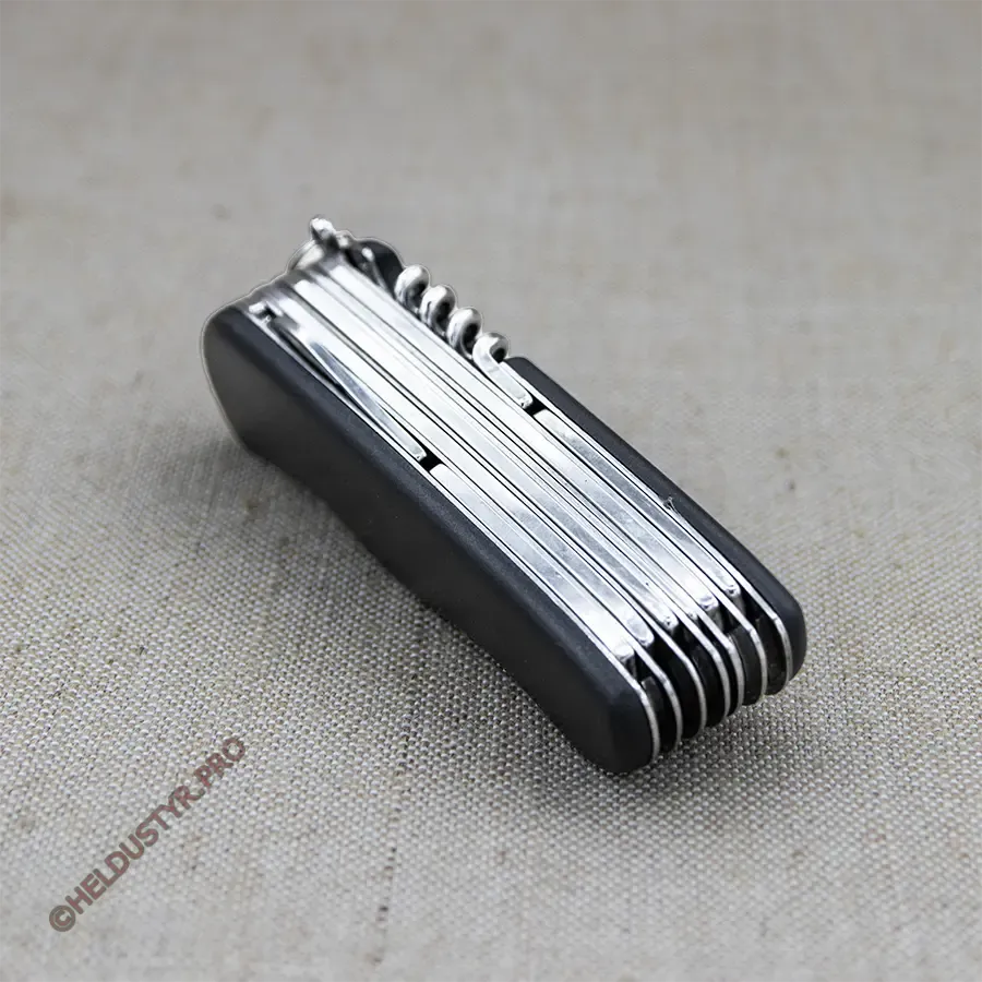 Інструменти: 1) ніж, 2) пилка для нігтів (напилок), 3) пила по дереву, 4) ножиці, 5) плоскогубці, 6) викрутка ph1, 7) викрутка ph2, 8) відкривашка пляшок з викруткою, 9) відкривашка банок з викруткою, 10) штопор, 11) кернер та шило